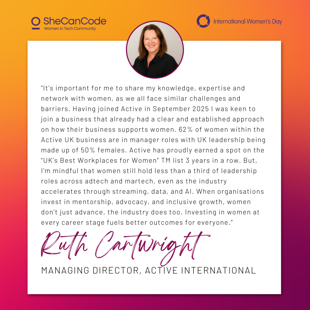 “It’s important for me to share my knowledge, expertise and network with women, as we all face similar challenges and barriers. Having joined Active in September 2025 I was keen to join a business that already had a clear and established approach on how their business supports women. 62% of women within the Active UK business are in manager roles with UK leadership being made up of 50% females. Active has proudly earned a spot on the “UK’s Best Workplaces for Women” TM list 3 years in a row. But, I’m mindful that women still hold less than a third of leadership roles across adtech and martech, even as the industry accelerates through streaming, data, and AI. When organisations invest in mentorship, advocacy, and inclusive growth, women don’t just advance, the industry does too. Investing in women at every career stage fuels better outcomes for everyone.”